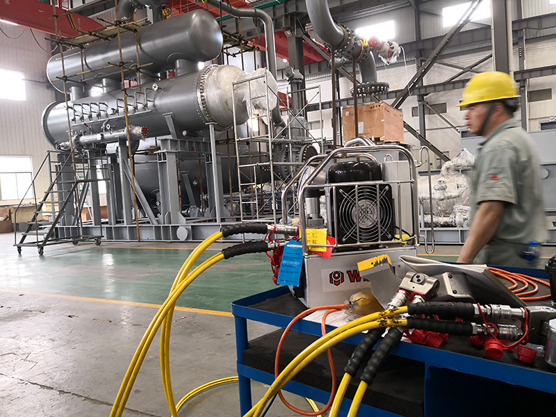 由于此設(shè)備是用于國外新能源地暖項(xiàng)目所必備的新型設(shè)備,必須要保證在出廠前加壓測試中,完全不泄露,所以在訂貨選型時(shí)我公司技術(shù)工程師按照現(xiàn)場客戶一系列的客觀因素為其選擇了我公司的3IBT驅(qū)動型液壓扳手3IBT&KLW4000以及高速耐用型電動液壓泵。