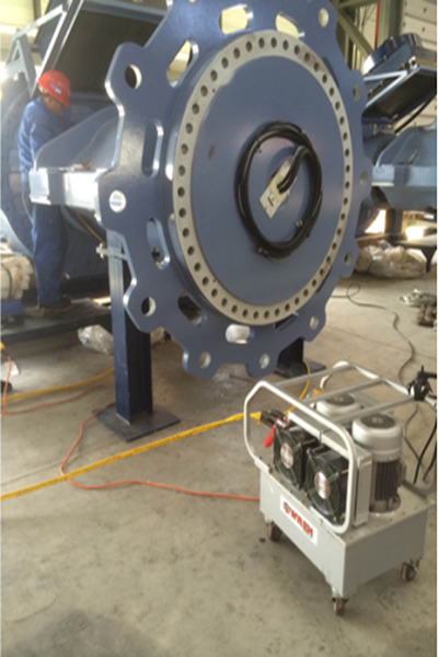 此次上海華儀客戶的現(xiàn)場(chǎng)工況為2.5MW風(fēng)機(jī)主軸脹緊套安裝,螺栓尺寸為M33。該處工況安裝,一直是所有風(fēng)機(jī)廠家比較拖效率的安裝工位,并且該工況相對(duì)于平常的主軸工況有所不同,軸承座離齒輪箱更近,無法放下驅(qū)動(dòng)型液壓扳手,而普通的中空扳手無法滿足將脹緊套和齒輪箱的安裝到完全平整,針對(duì)這個(gè)情況,為提升客戶工作效率、減輕工作強(qiáng)度、釋放工作人工,我方主動(dòng)研發(fā)大流量、高速雙電機(jī)泵站,型號(hào)為2ATWH DHP-380*2,并配套設(shè)計(jì)研發(fā)了加強(qiáng)型純平中空扳手以應(yīng)對(duì)流量大量增加后扳手的使用強(qiáng)度及使用壽命等問題。