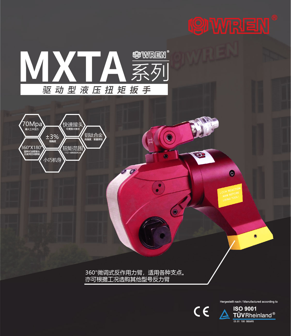 MXTA系列是WREN公司主力投放國(guó)內(nèi)市場(chǎng)的一款專業(yè)級(jí)別的液壓扭矩扳手。其鋁鈦合金的航空材料的液壓扭矩扳手重量輕,強(qiáng)度高,值得注意的是MXTA系列液壓扭矩扳手擁有從112N.m-48666N.m共8個(gè)標(biāo)準(zhǔn)型號(hào),可以出色完成螺栓的鎖緊以及拆卸工作。WREN品牌提供全球售后服務(wù),擁有完整的配套供應(yīng)能力,通過德國(guó)萊茵TUV認(rèn)證及歐盟CE認(rèn)證。