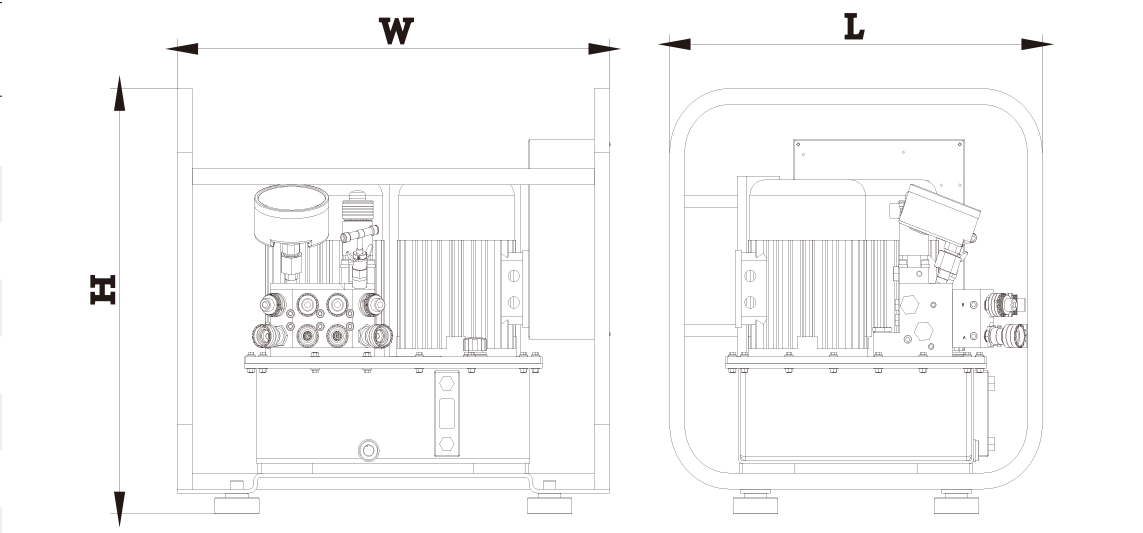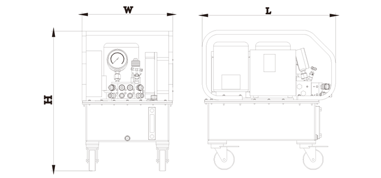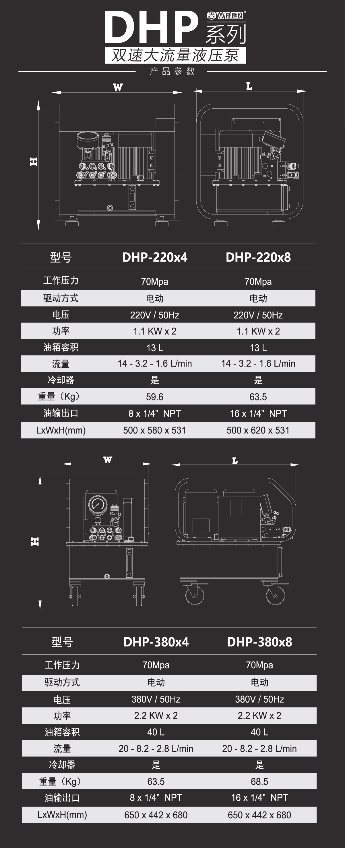 型號 DHP-220×4 DHP-220×8 工作壓力 70 MPa 70 MPa 驅動方式 電動 電動 電壓 220V / 50Hz 220V / 50Hz 功率 1.1 KW × 2 1.1 KW × 2 油箱容積 13 L 13 L 流量 14 - 3.2 - 1.6 L/min 14 - 3.2 - 1.6 L/min 冷卻器 是 是 重量 59.6 Kg 63.5 Kg 油輸出口 8 × 1/4" NPT 16 × 1/4" NPT L×W×H (mm) 500×580×531 500×620×531