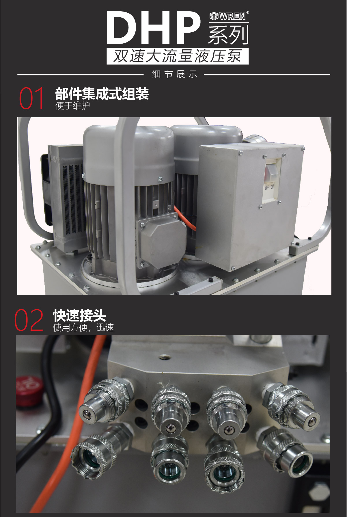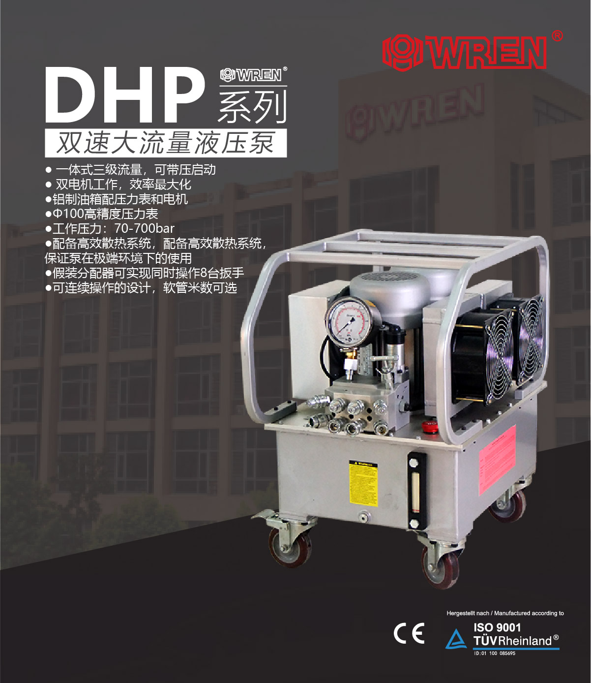 DHP系列為液壓扳手專用泵,采用集成方式組裝,由動力單元、電氣單元、控制裝置等組成的一種獨立完整的液壓裝置,具有流量大、體積大、重量輕、結構簡單、操作方便、工作壓力高等特點,并且高壓出口(A口)出油壓力可在70~700bar之間任意調節(jié)。