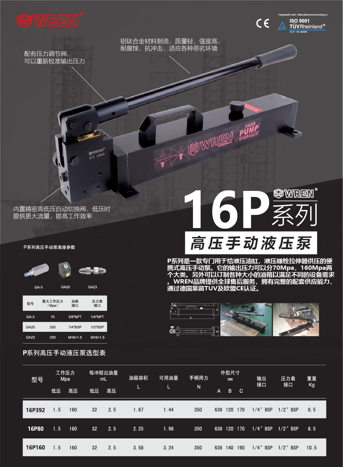16P系列是一款專門用于給液壓螺栓拉伸器供壓的便攜式高壓手動泵它的輸出壓力是160MPa。另外可以定制各種大小的油箱以滿足不同的設(shè)備需求。WREN品牌提供全球售后服務(wù),擁有完整的配套供應(yīng)能力,通過德國萊茵TUV及歐盟CE認(rèn)證。